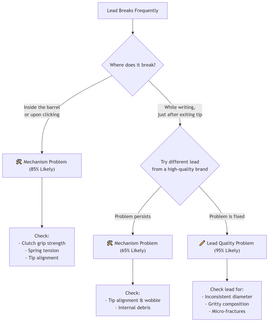 - Weak or Worn Clutch: The clutch is the metal gripper that holds the lead. If it doesn’t grip evenly or has sharp, burred edges, it will crush the lead instead of holding it.